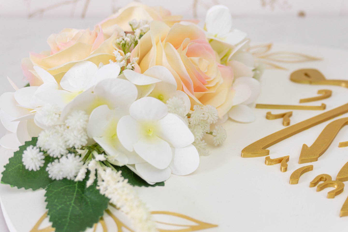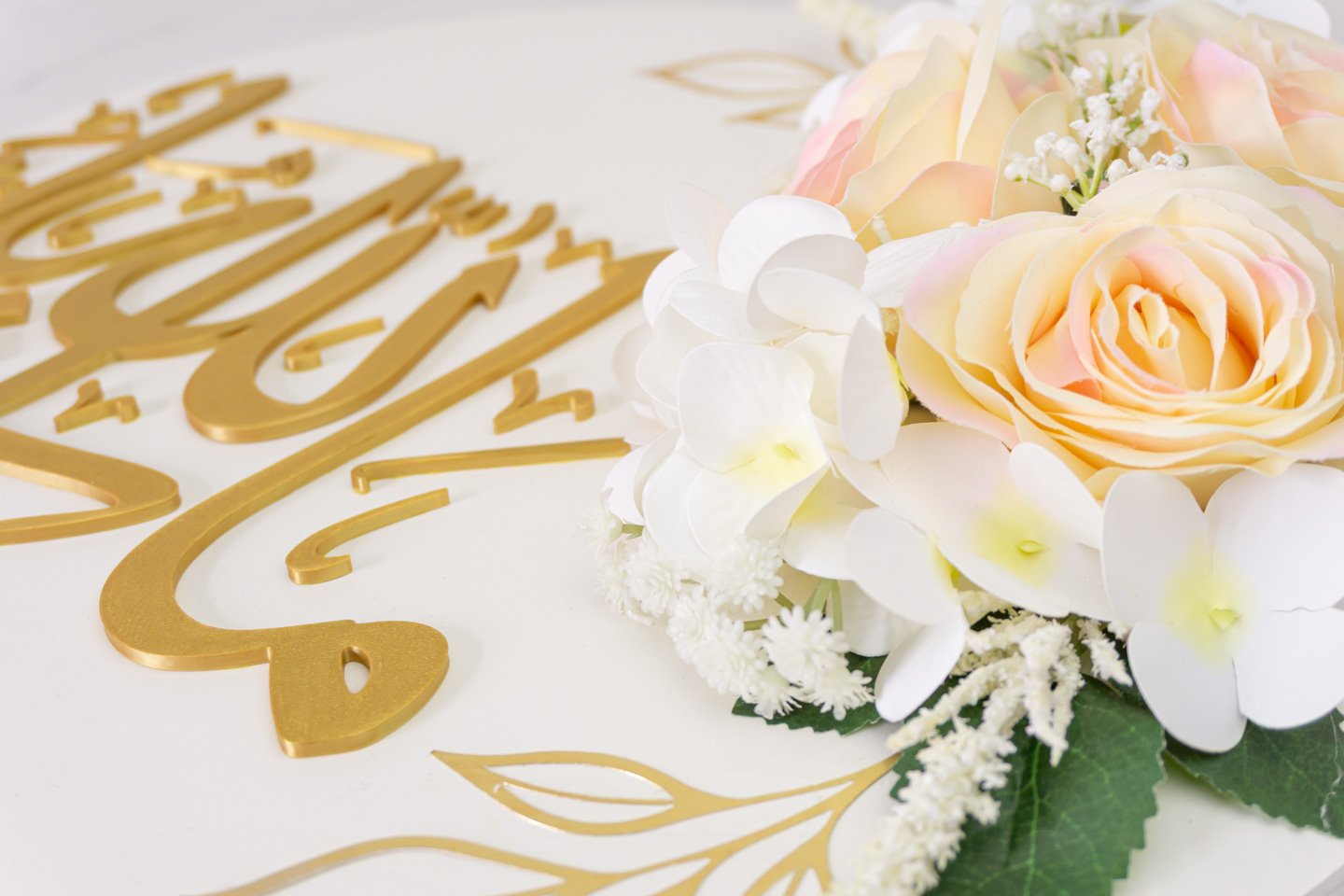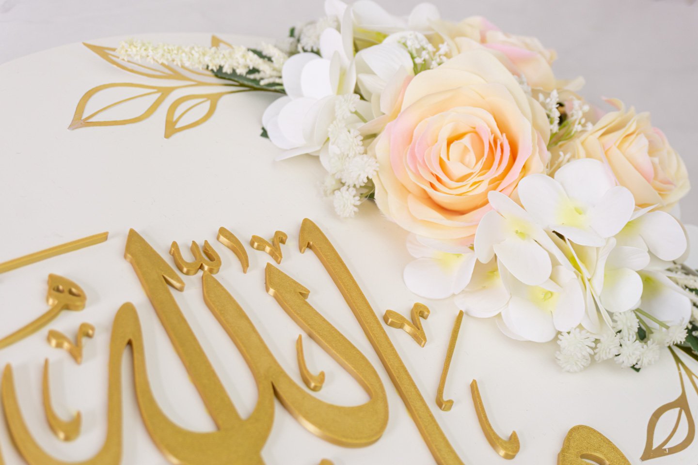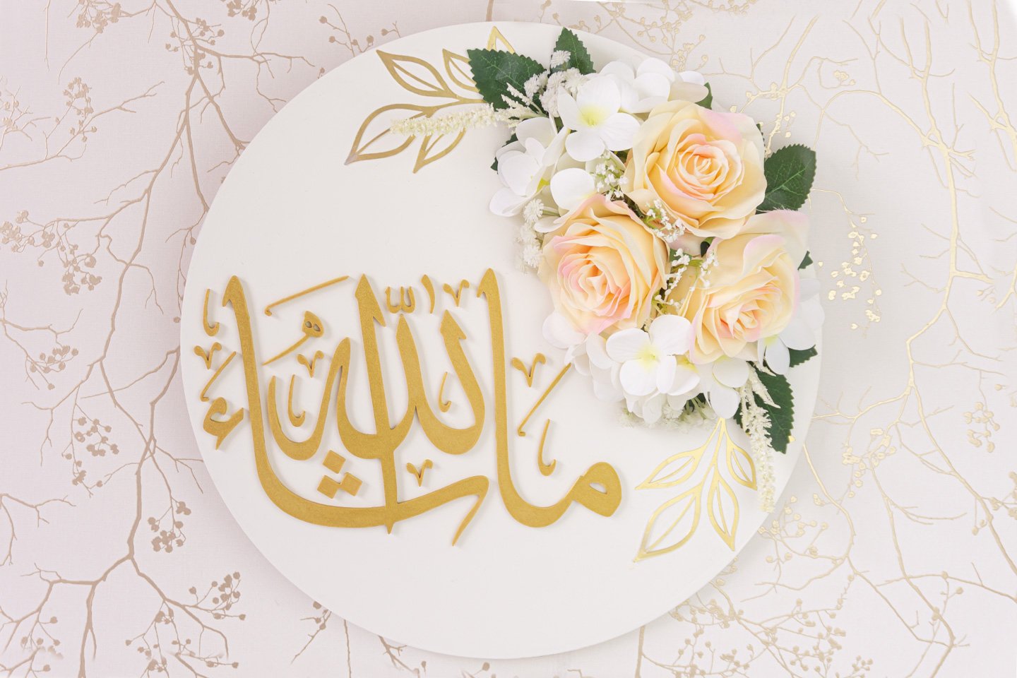 This handcrafted board blends reverence with modern styling—soft peach rose florals on a crisp white base that reads as refined and welcoming for entryways, console tables, and Ramadan or Eid setups without looking generic. The round shape and neutral tones make it effortless to layer with lanterns and framed prints for a balanced vignette that complements contemporary homes.
