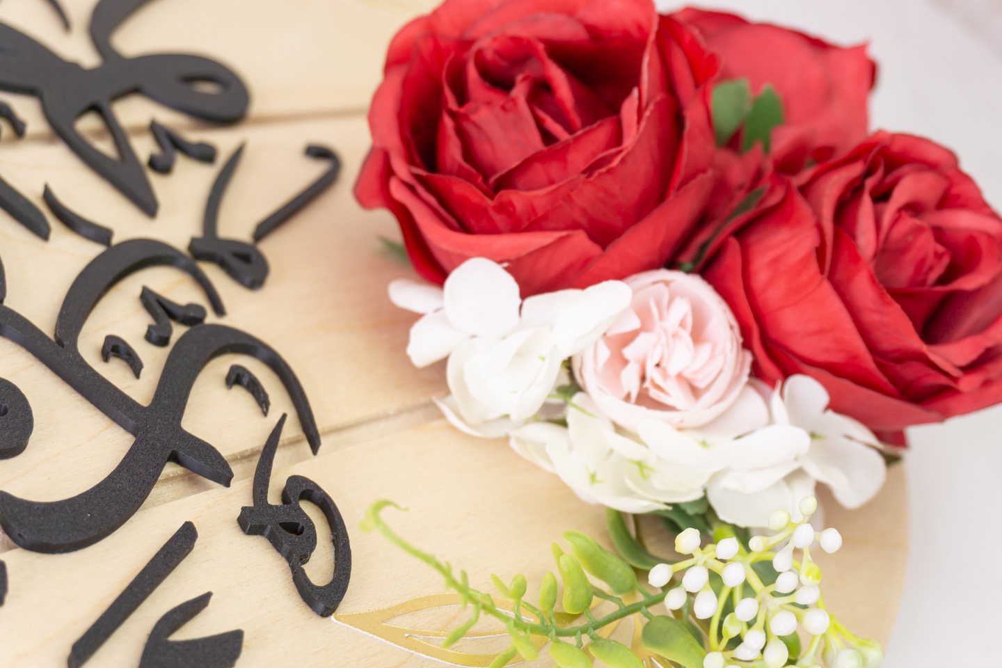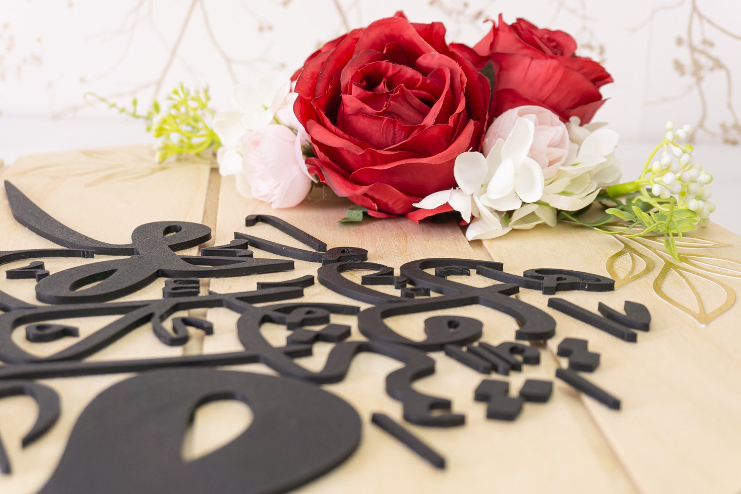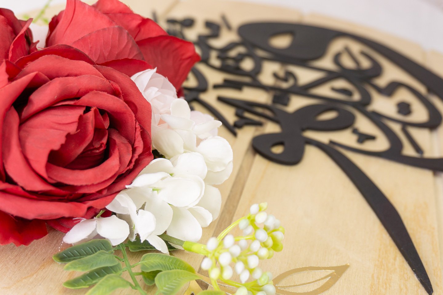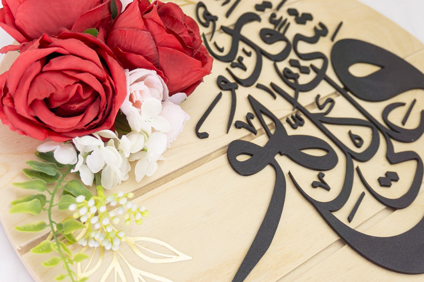 Each piece is arranged and finished by hand, pairing Arabic calligraphy with vivid red florals on natural wood for an heirloom feel that elevates entryways, living rooms, and prayer corners without looking generic or mass‑produced. Ideal as a meaningful gift for Ramadan and Eid or as an all‑season statement that blends reverence and warmth in the home.