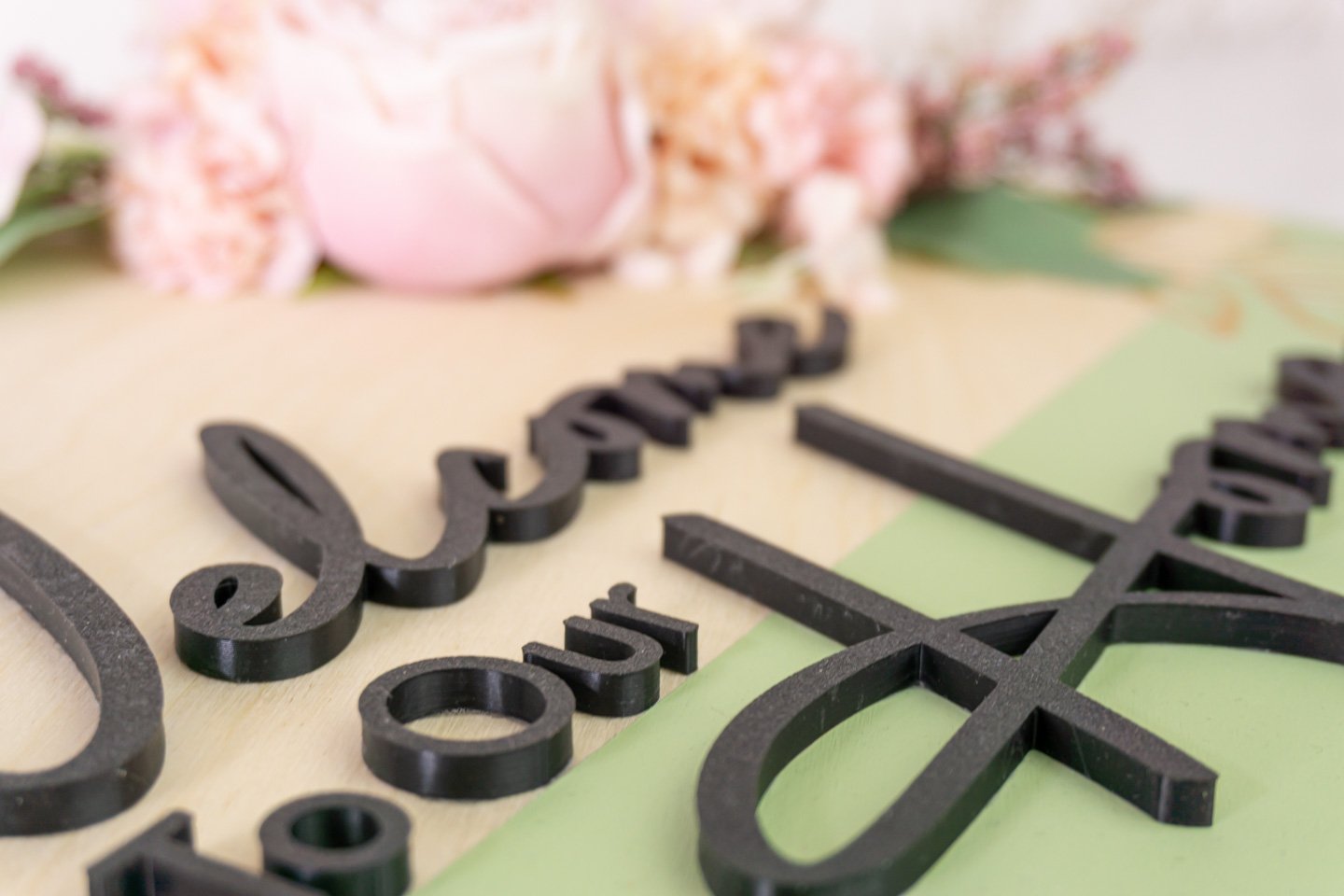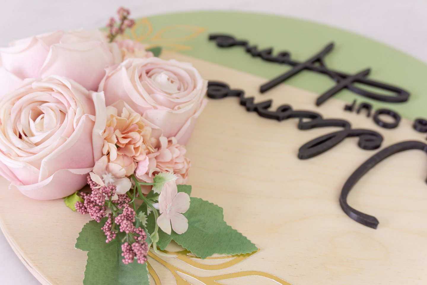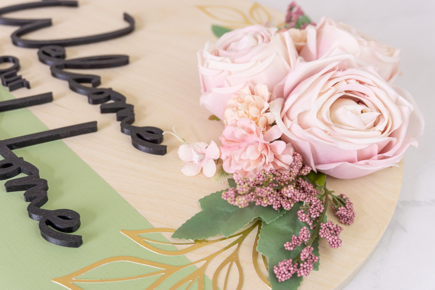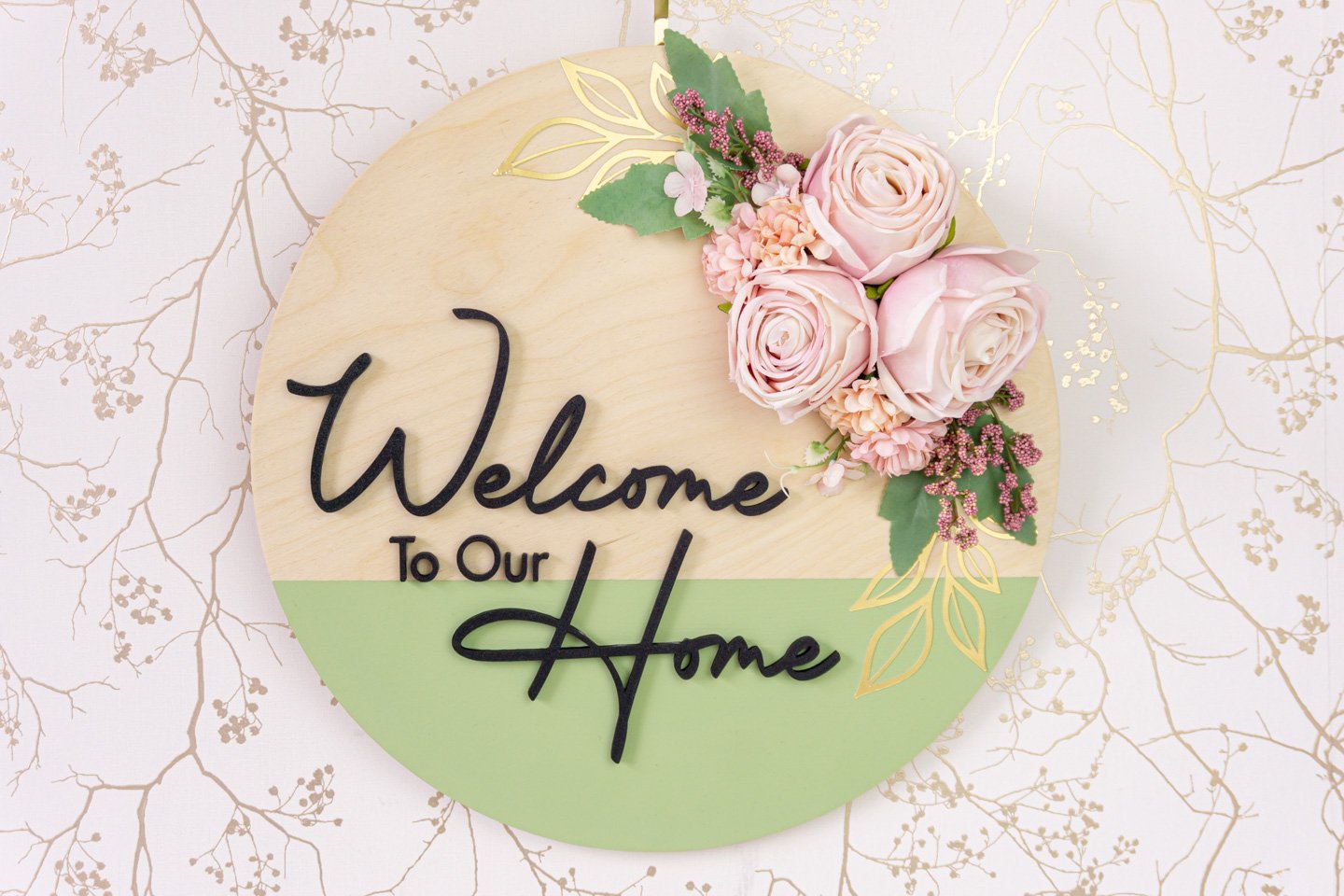 14″ Elegant Natural Wood with Green Background Board, featuring a beautiful floral arrangement of Pink Flowers. The centerpiece showcases textured shimmering black 3D lettering that reads “Welcome To Our Home”.